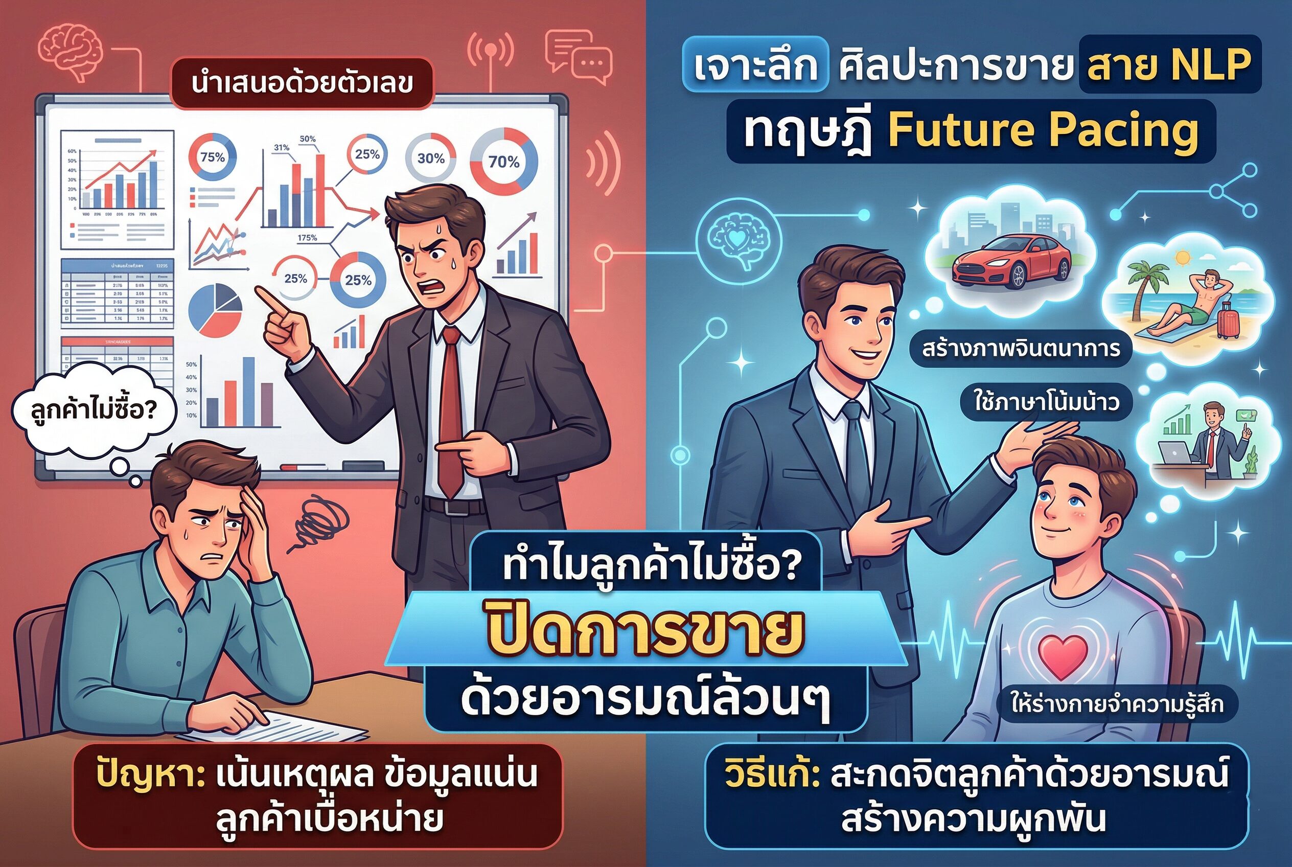 กฎเหล็กที่สำคัญที่สุดของ จิตวิทยาการขาย คือ ลูกค้าไม่ได้อยากซื้อสว่านเจาะผนัง แต่ลูกค้าอยากได้ “รู” เพื่อแขวนรูปภาพของครอบครัวอย่างสวยงาม การที่คุณเชี่ยวชาญศาสตร์ NLP และวิชา Future Pacing มันคือการมอบตั๋วเครื่องบินข้ามเวลา พาลูกค้าไปสัมผัสกับความรู้สึกอบอุ่นตอนที่ได้นั่งมองรูปภาพนั้นบนผนังบ้าน ทันทีที่ร่างกายของเขาสัมผัสได้ถึงความสุข (Somatic Markers) การ เทคนิคปิดการขาย ของคุณก็เป็นเพียงแค่การส่งปากกาให้เขาเซ็นรับอนาคตอันสดใสที่เขากำลังโหยหาอยู่เท่านั้นเองครับ!
