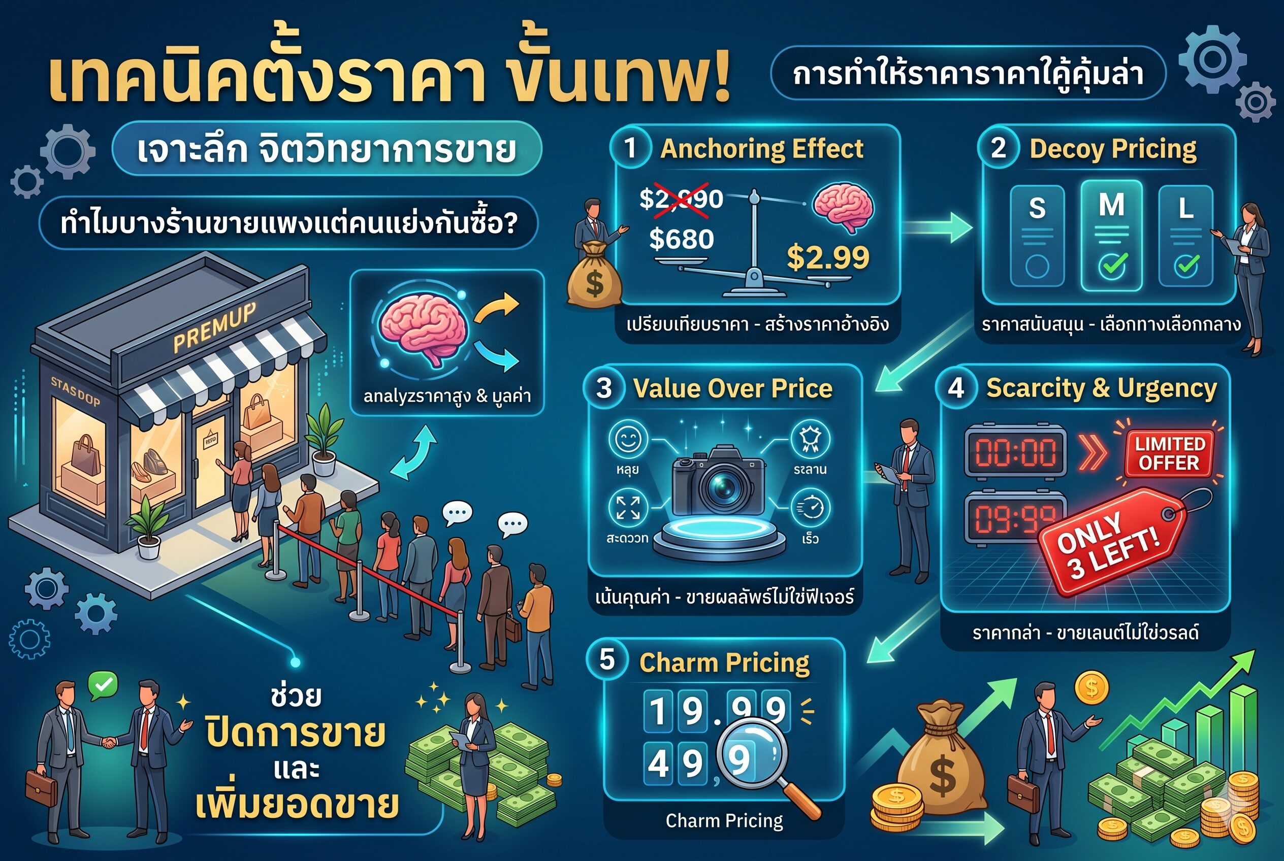 เมื่อลูกค้าบอกว่า “แพง” เขาไม่ได้หมายความว่าเขาไม่มีเงิน แต่เขาหมายความว่า “เขาหาเหตุผลมาสนับสนุนการจ่ายเงินก้อนนี้ไม่ได้ (Not Worth It)” วันนี้ DigitalD2M จะพาคุณมาปลดล็อก จิตวิทยาการขาย สายดาร์ก! เราจะมาเจาะลึก เทคนิคตั้งราคา แบบที่แบรนด์ระดับโลกใช้สะกดจิตผู้บริโภค มาดูกันว่าคุณจะ ตั้งราคาสินค้า อย่างไรให้ลูกค้ารู้สึกว่า “ถ้าไม่ซื้อตอนนี้คือพลาดมาก!” โดยที่คุณไม่ต้องลดราคาสินค้าลงแม้แต่บาทเดียว เพื่อ ปิดการขาย และ เพิ่มยอดขาย ให้ได้กำไรเนื้อๆ เน้นๆ แบบเจาะลึกทุกกลไกครับ!